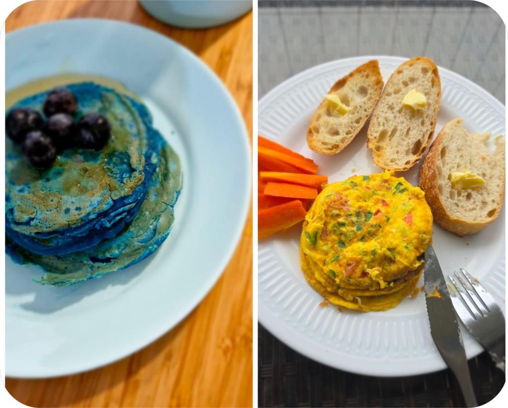 So how about a brekkie with toasted sourdough served with deliciously colourful and packed-with-health, lean omelette, presented with a side of crudités? Sounds exotic, doesn’t it? There is more. To appease the sweet tooth, may we present pure indulgence in the form of blue pancakes topped with blueberries and maple syrup, an original recipe curated by the teen chef in making, crafted to perfection?